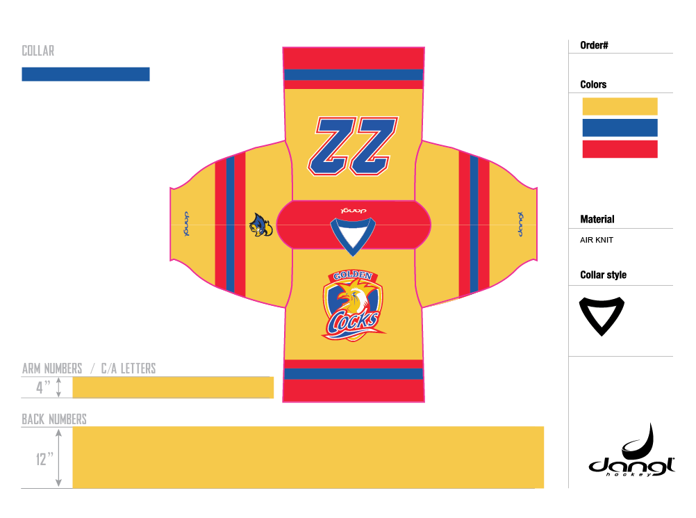 Captain Bill Kelly and the Golden Cocks hockey team needed modernized jerseys to outfit their growing lineup, while using their 2010 jersey as the inspiration for the designs. They wanted two separate kits; a home jersey featuring a primary color of clean white, and an alternate jersey with their strong, fierce gold as the primary.